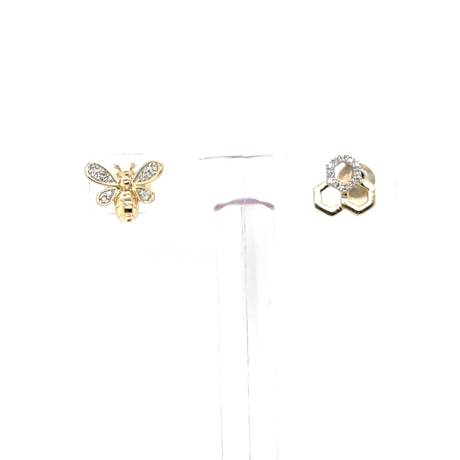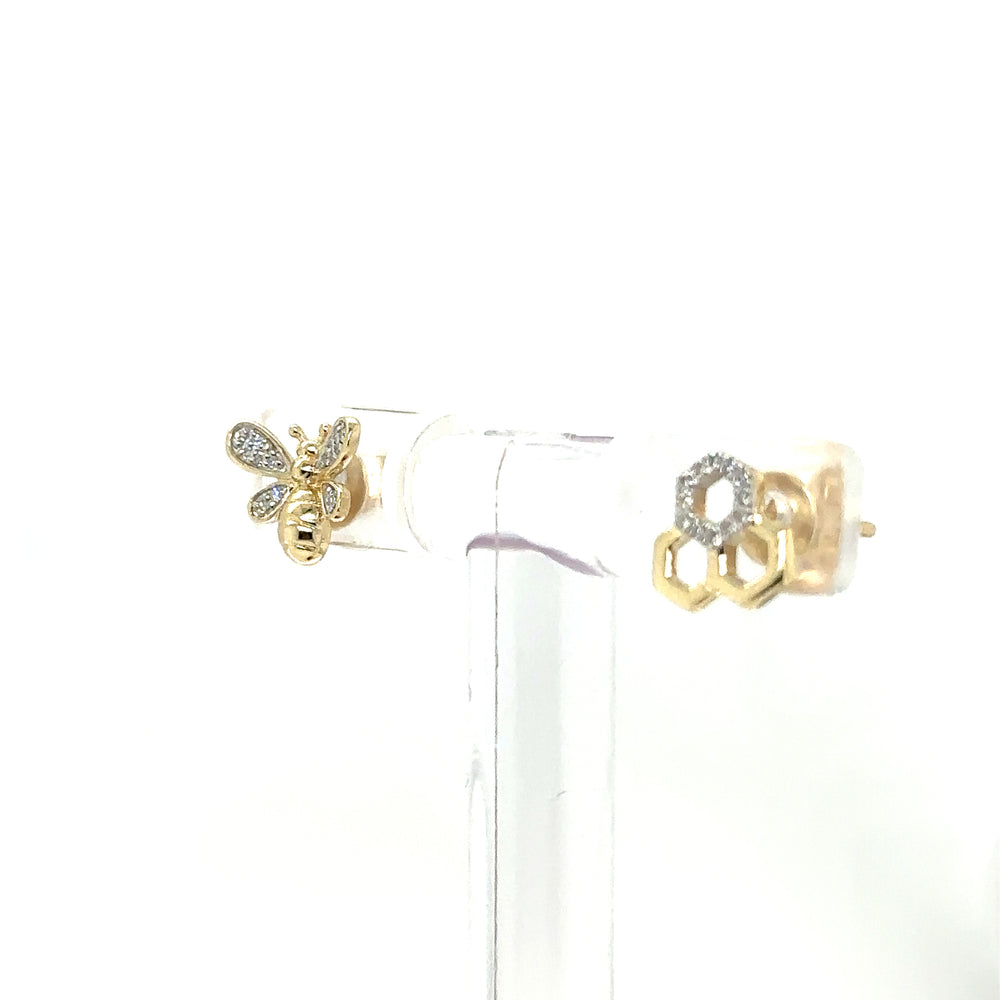 A-Symmetrical Yellow Gold Honey Bee and Honey Comb Diamond Studs