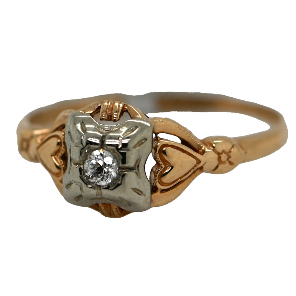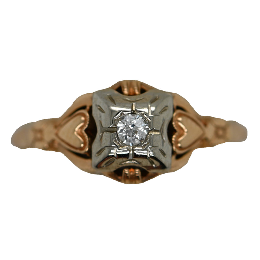 Crafted in a 14K two-tone setting, this antique engagement ring features a diamond at its center. Its filigree and illusion head add to its unique and ornate design.