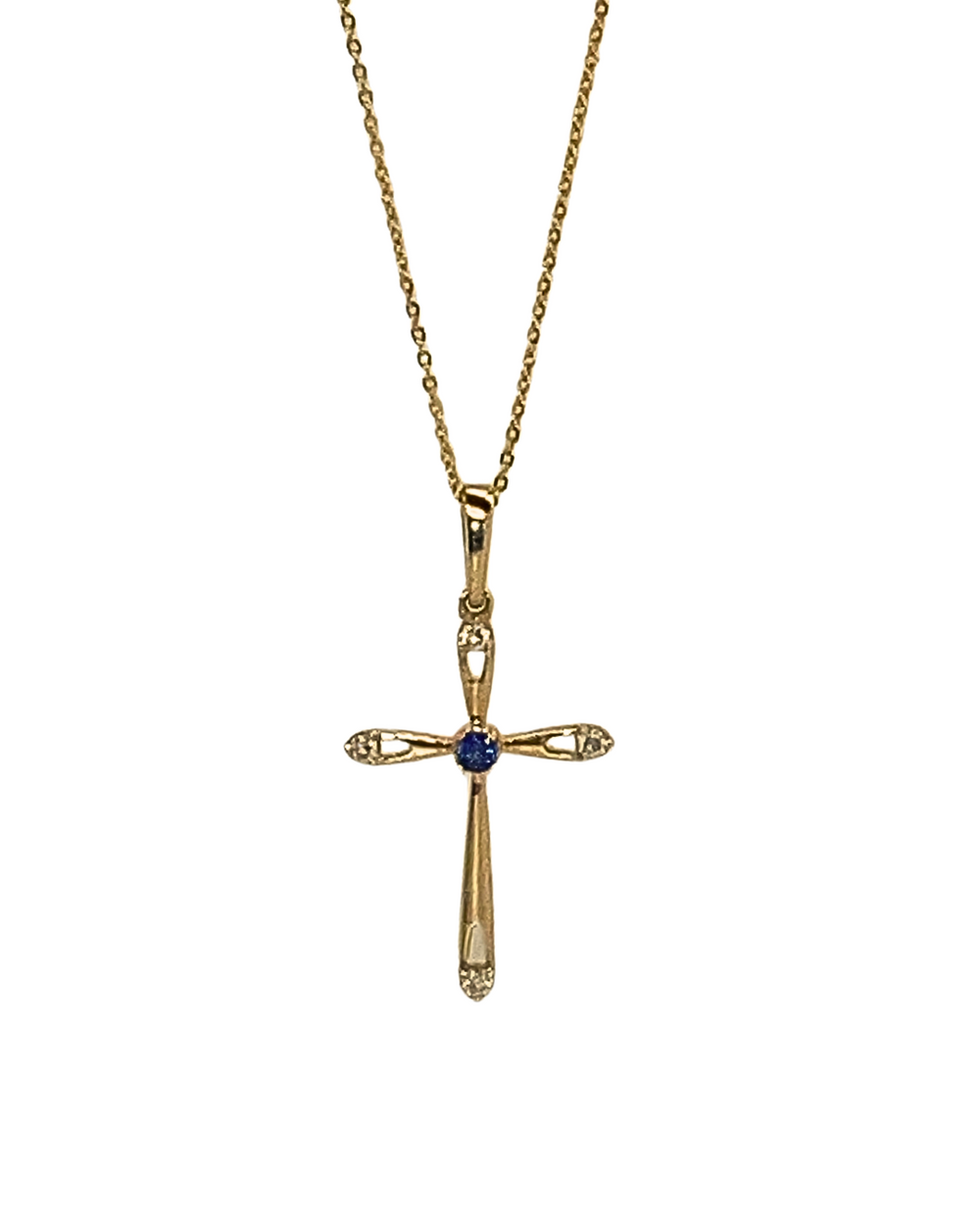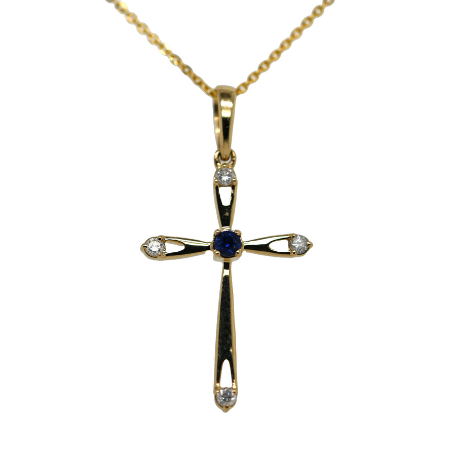 Product Details: 14KY .08ct natural diamond and blue sapphire cross pendant with solid bail and adjustable 16-18" rolo chain.