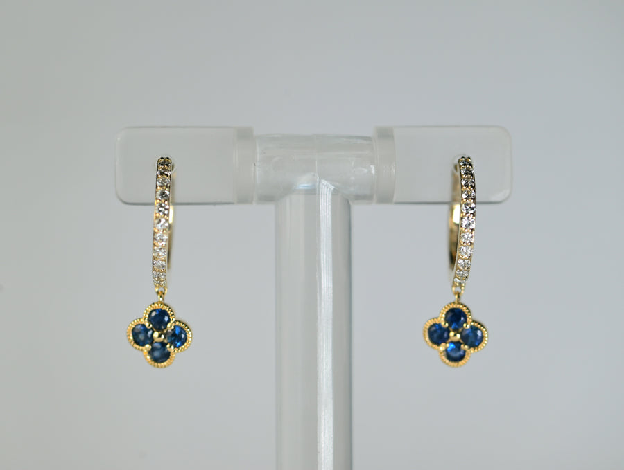14KY Hoop earrings w/ a Dangle Clover design composed of four saphires in a milgrain bezel=0.45ctw w/ dia accent pave on the hoops.=0.25ctw