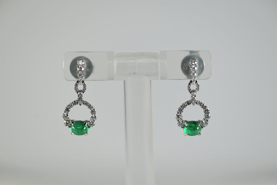 18KW, Two cab natural oval emeralds (oil)= .81cts, with natural diamond accent 46 RBC= .57cts, drop post earrings with heavy backs