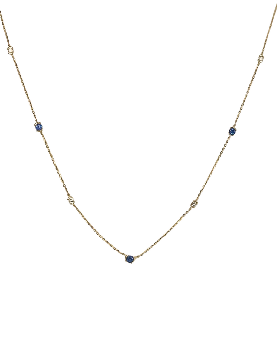 14KY, Station Necklace, 18", 4 RBC dia = .12ctw, 3 RBC nat blue saph (heat) = .24 ctw