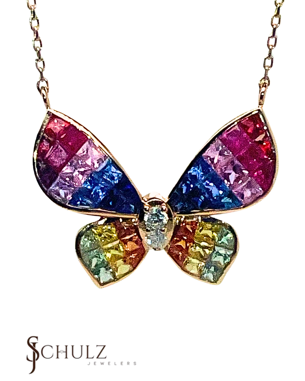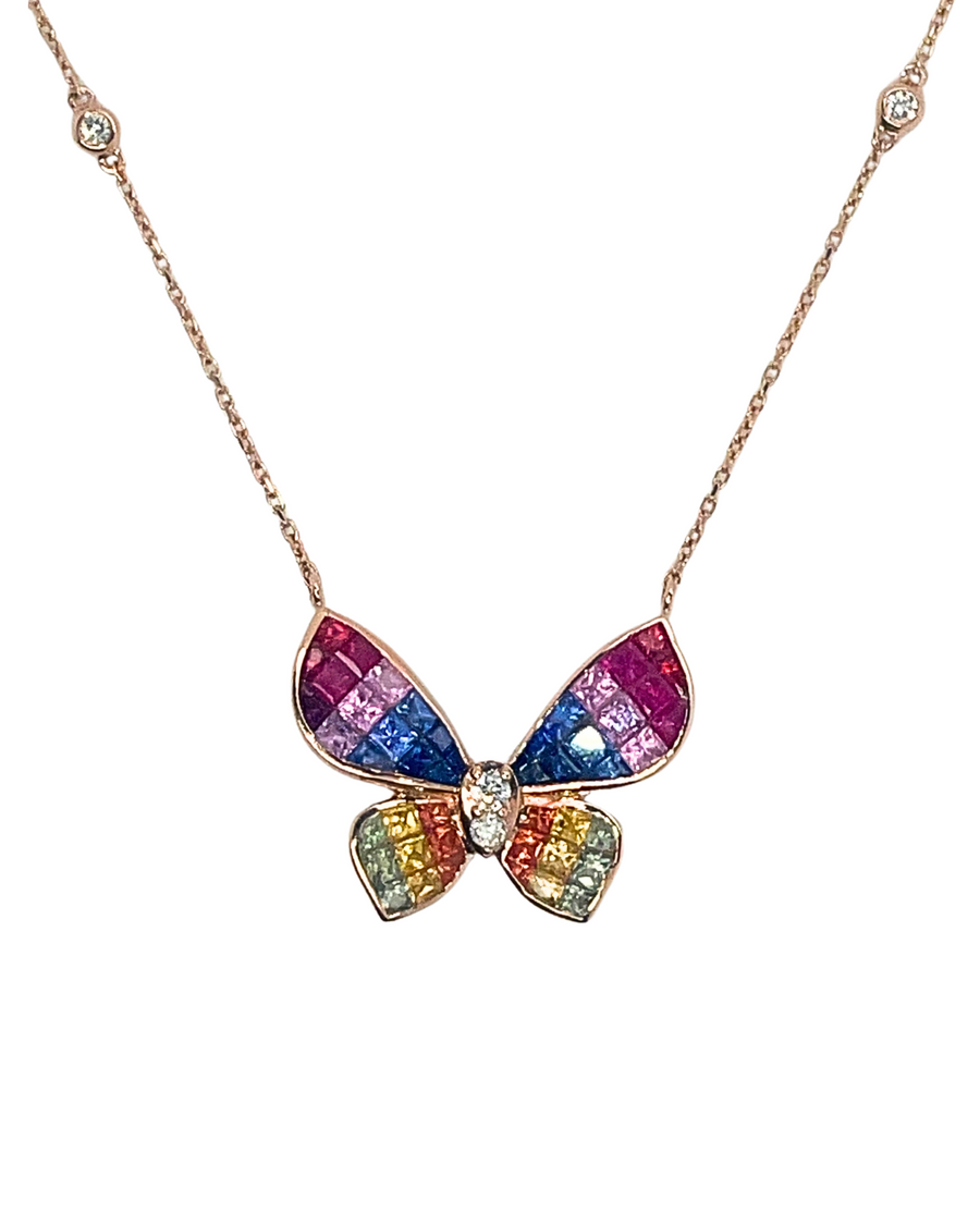 18K P natural multicolor saphire(heat) 48=2.50cts, natural diamonds 3=0.14cts, butterfly shaped pendant.