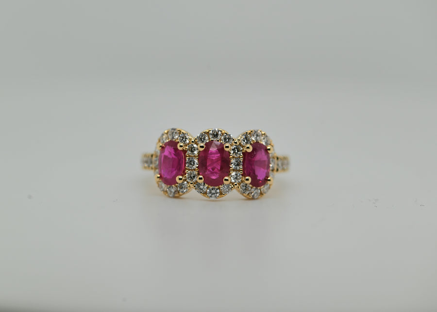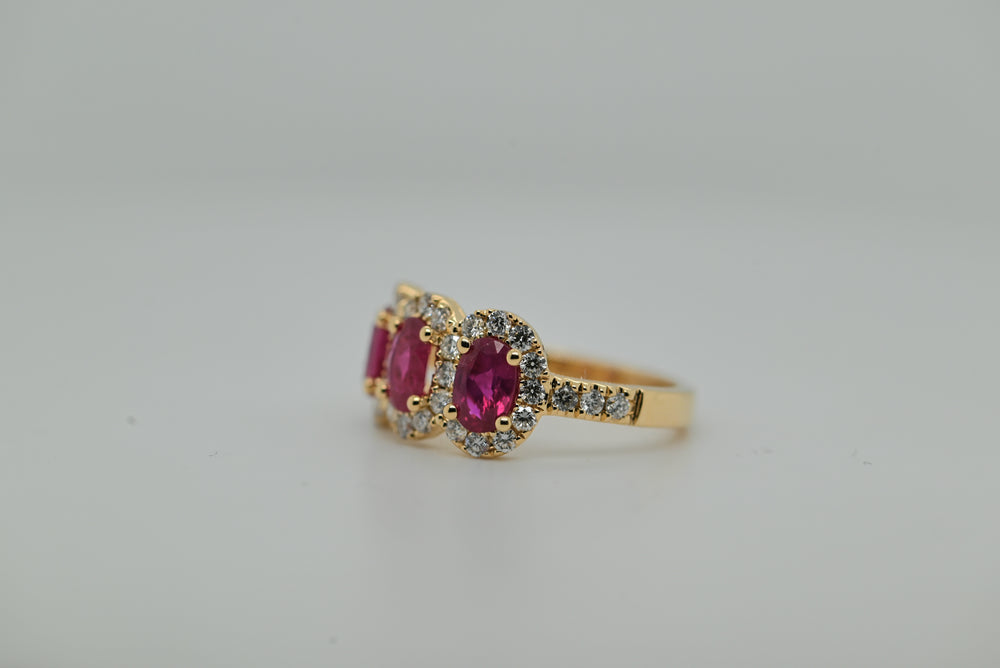 18KY, Three natural oval rubies (heat)= 1.53cts with natural diamond halo, 36 RBC= .65cts.