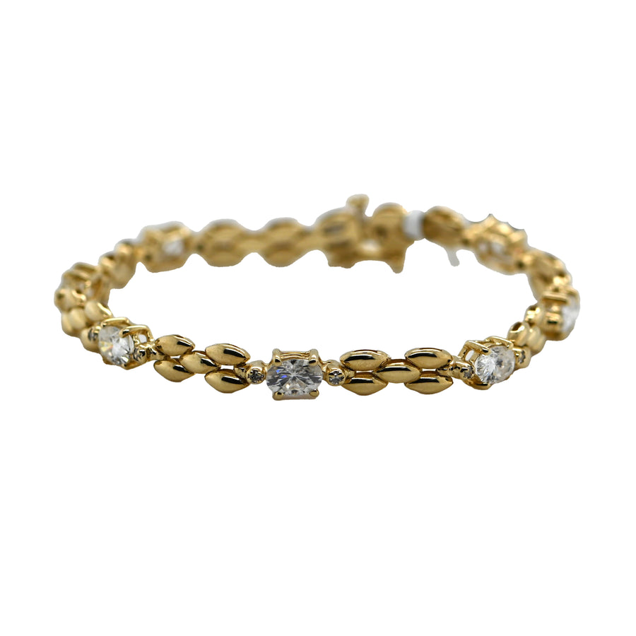 Product Details: 14KY 6.5dwt, 3.5ct oval moissanite gemstones and .21ctw s/c nat diamond bracelet