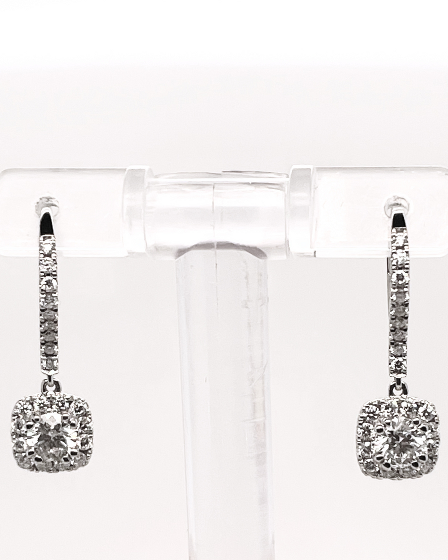 14KW, 44 natural diamonds= 1.10ctw, SI/G, French lever and cushion halo style earrings 2.31gr