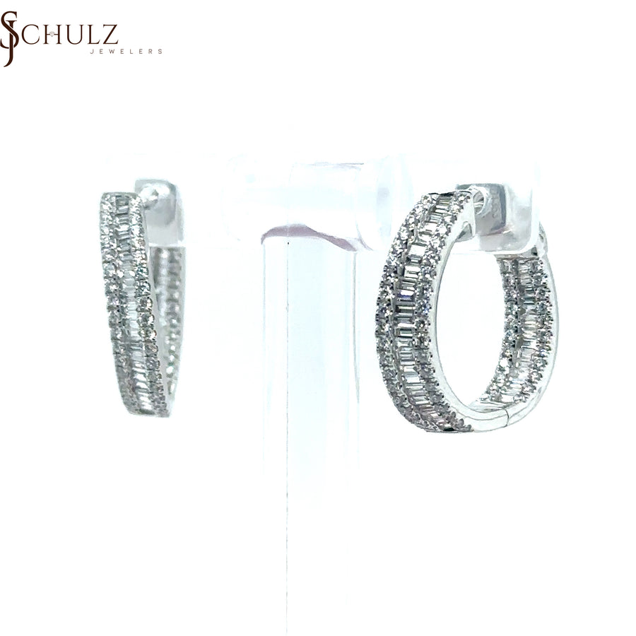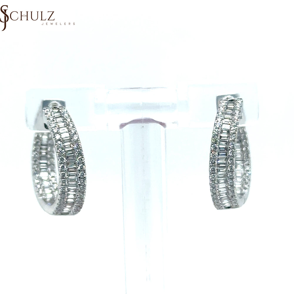 18kw natural diamond hoop earrings, 120rbc= .65ct, 78 bags=.71cts, 1.36ctw channel set with pave bars, in/out style, safety lock.