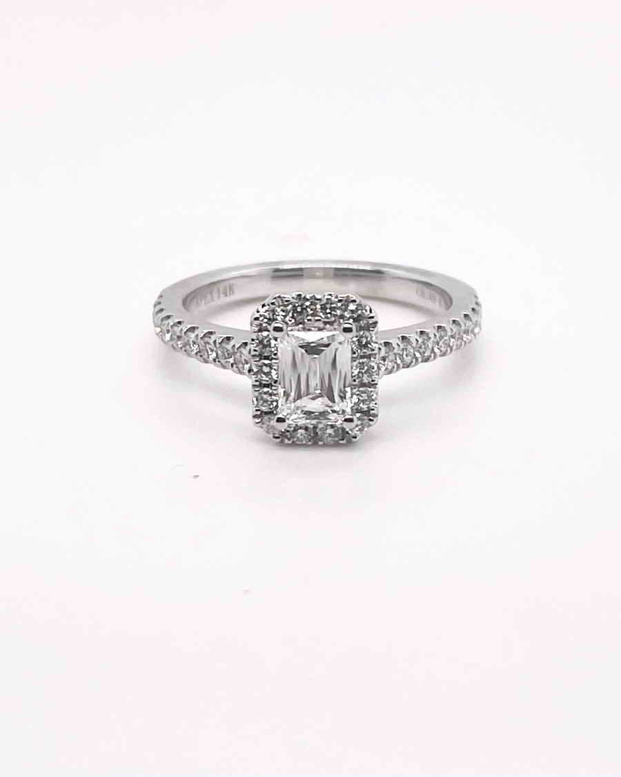 14KW, .69ct natural emerald diamond, ApexCut, E/SI1, 32 rbc halo and cathedral shank accent, 3.31gr