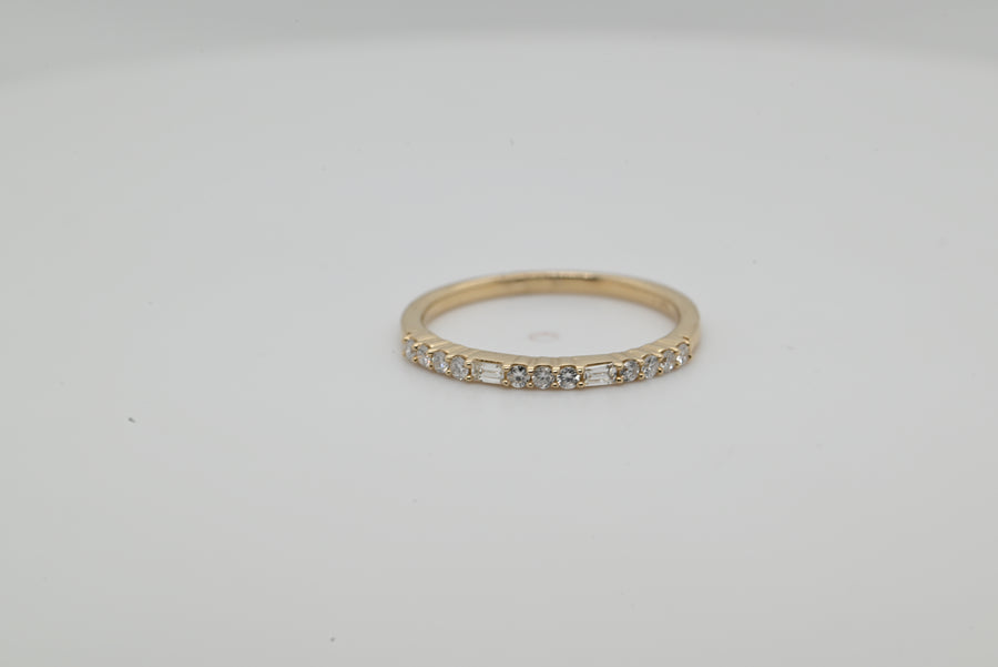 14KY Diamond Band, Shared prong, 10 small rd dia and two Baguettes= 0.25ctw