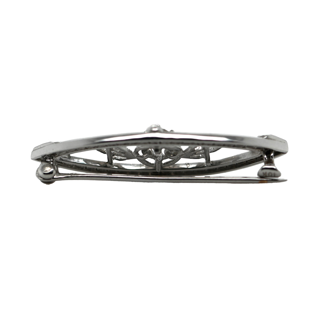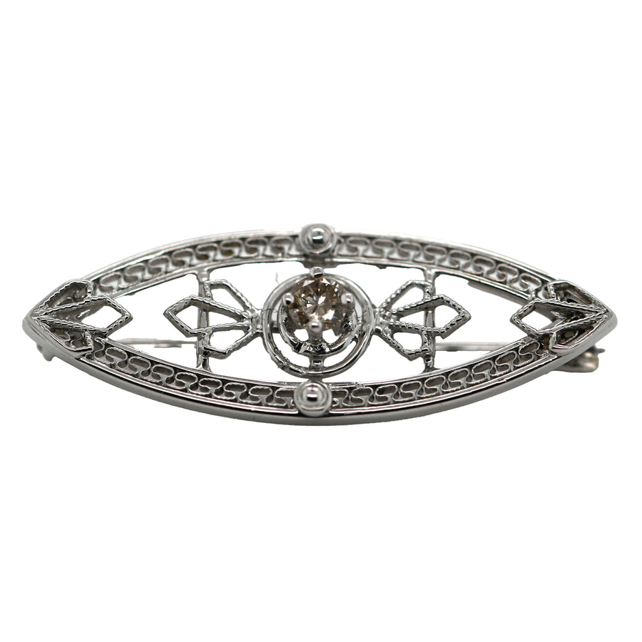 This filigree brooch features a natural diamond accent in a marquise shape.