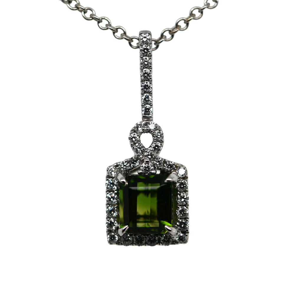 Product Details: 18KW, .34ctw natural diamond square halo with bail, 1.54ctw natural bi-color tourmaline, with 18" rolo chain with claw catch (MC:IEM)