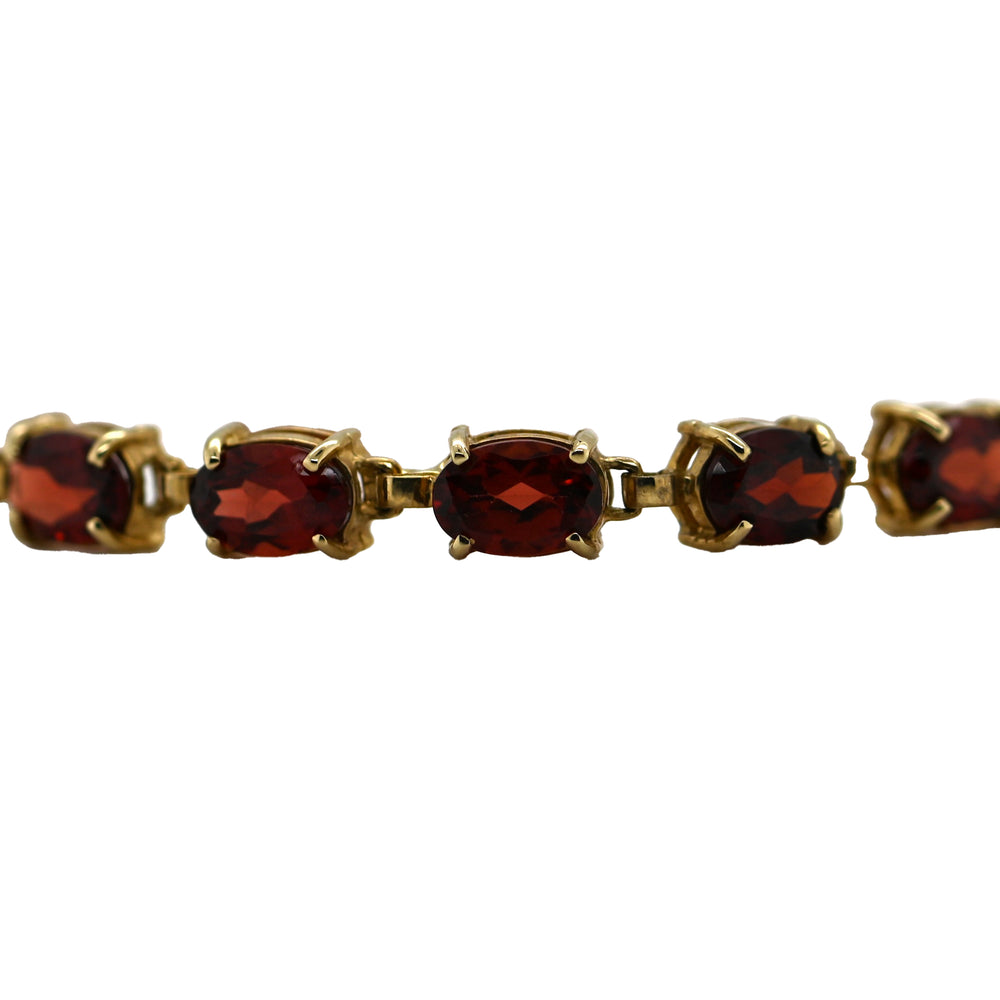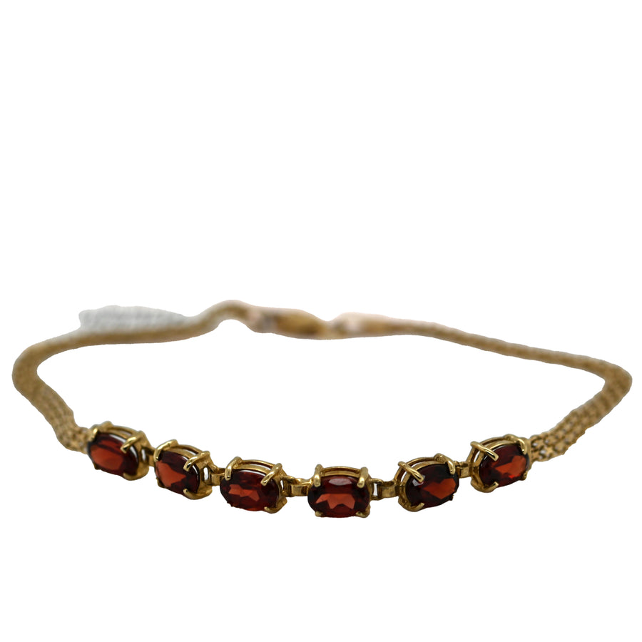 This elegant mesh bracelet features a set of 4-prong-set red garnets, all crafted in yellow gold.