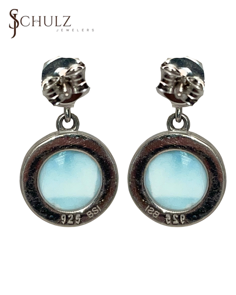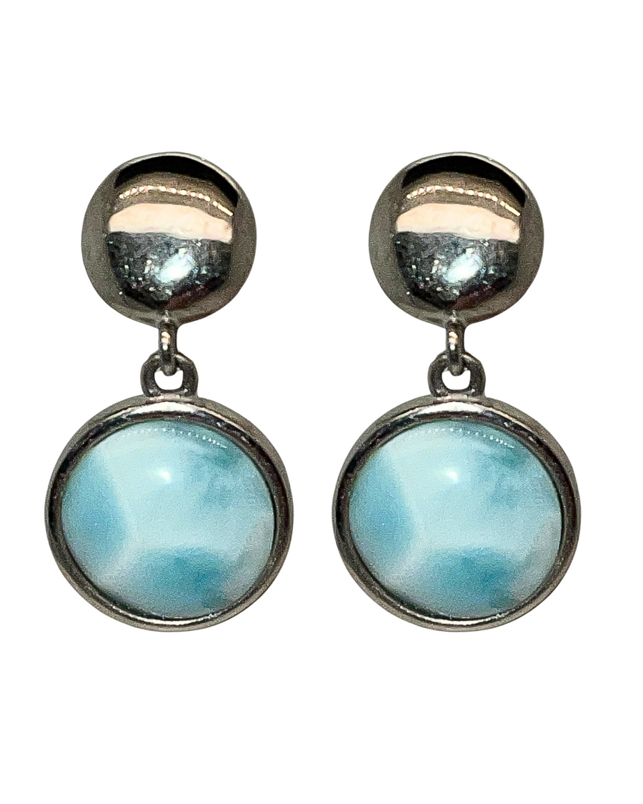 SS Drop down Larimar post earrings in a bezel set , Tension back