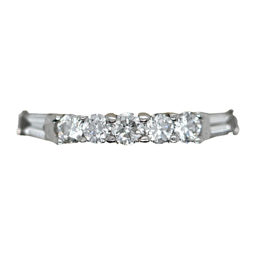 Featuring round brilliant cut and baguette natural diamonds, this curved wedding band showcases a classic and elegant design.