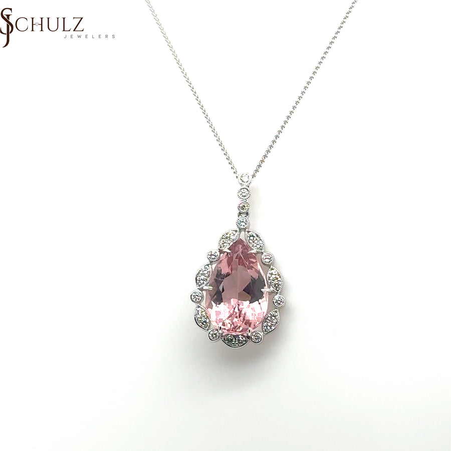14KW, bead set vintage pear halo frame .45ctw (AOR), natural (heat) morganite, 6.25ctw, pear shape 16x10mm, and 18" dia cut wheat w/ claw