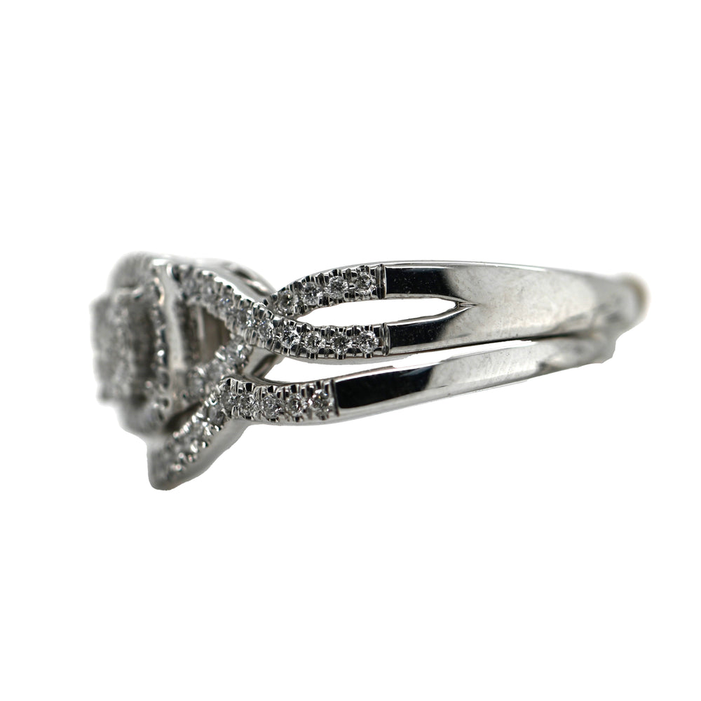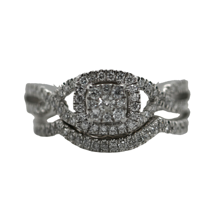 This stunning ring features a double cushion cluster halo with a diamond, resting on a pave infinity shank. Complete the look with the matching contoured band for pure elegance.